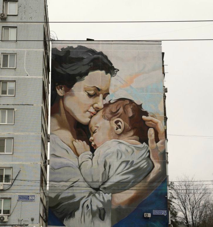 На фасаде дома №27 по улице Адоратского ко Дню матери появился трогательный мурал — объятия матери и ребёнка. Дом расположен напротив перинатального центра городской клинической больницы №7 имени Марата Садыкова, что делает композицию особенно символичной.