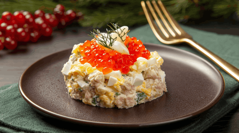 - Слоёный салат «Северное сияние»: Сложная многослойная структура с сёмгой, картофелем и нежным творожным сыром не только удивит, но и поразит своим вкусом.