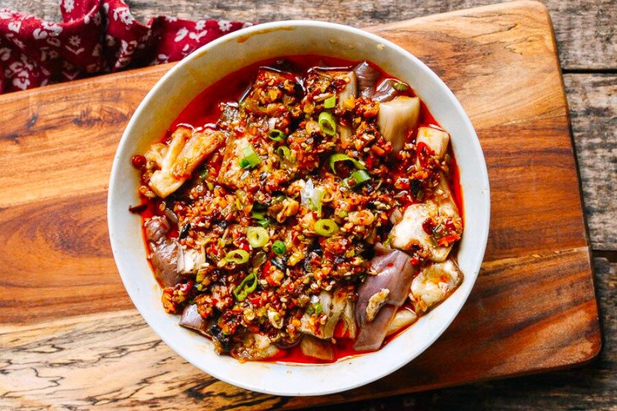 Баклажаны нарезать на брусочки длиной около 7 см. Поместить их в пароварку и готовить около 10 минут до мягкости. После этого переложить в глубокую тарелку, добавив немного образовавшегося сока.Приготовить овощи: нарезать чили, измельчить имбирь и чеснок, а зеленый лук — на мелкие кусочки.На сковороде разогреть растительное и кунжутное масло на среднем огне. Всыпать имбирь и семена кунжута, обжаривать, помешивая, примерно 15-20 секунд.Добавить чили-масло, кунжутную пасту, соевый соус, сахар и немного соли. Смешать ингредиенты до полного растворения сахара.Когда соус начнет закипать, выключить огонь и добавить нарезанный перец чили, чеснок и половину зеленого лука junto с ферментированными бобами. Если используете тайский чили, сейчас самое время его добавить.Тщательно перемешать все компоненты и полить баклажаны приготовленным соусом. Посыпать оставшимся зеленым луком и подавать к столу.Каждый кусочек баклажана будет пронизан насыщенным вкусом специй, что делает это блюдо идеальным вариантом для тех, кто ищет разнообразия в повседневном меню. Приятного аппетита!