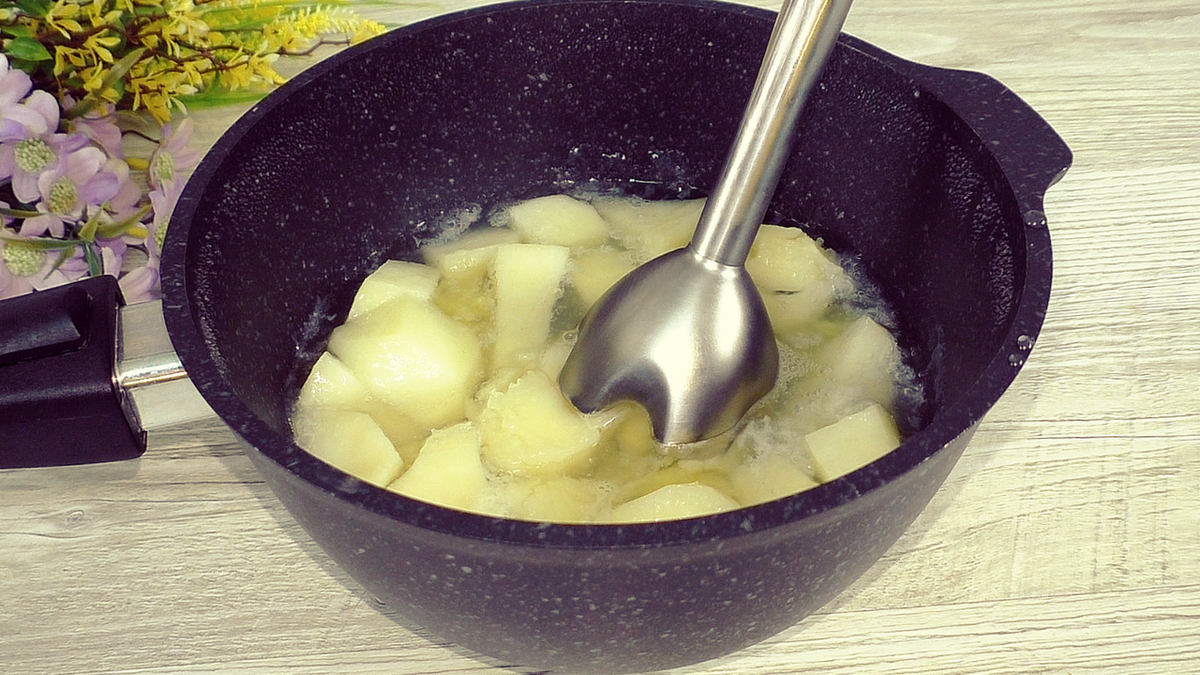 Картофель нарезается кубиками и варится в воде. После того как картофель станет мягким, его нужно размять вместе с отваром с помощью блендера. Получившаяся масса остужается до теплого состояния.