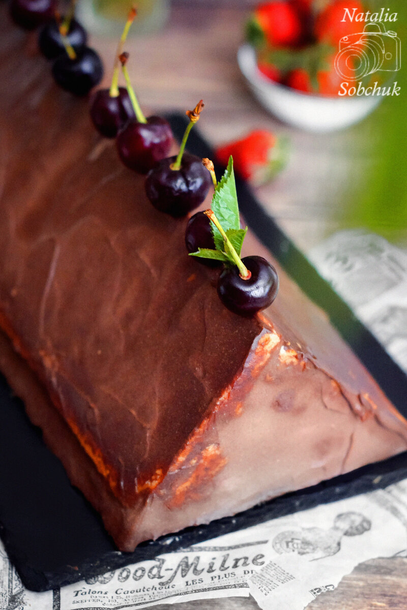 Напоследок, готовится шоколадная глазурь из сметаны, масла, сахара и какао. Ингредиенты смешиваются и доводятся до кипения, после чего остывшую глазурью поливают торт. Десерт можно украсить по вкусу, добавляя свежие ягоды или шоколадные стружки, придавая ему еще больше изыска.