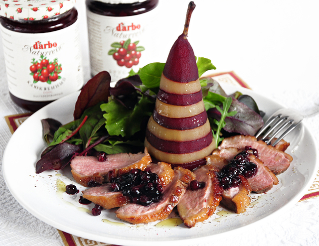 Шаг 6: На тарелке расположите утиную грудку и пьяную грушу, полейте все соусом. Приятного аппетита!