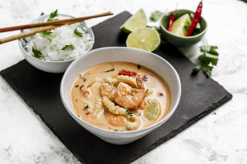 Шаг 5: В завершение влейте горячий бульон с кокосовым молоком в сковороду, прогрейте одну минуту, при этом выжмите сок лайма. Подавайте суп с рисом, наслаждаясь уникальным тайским вкусом.