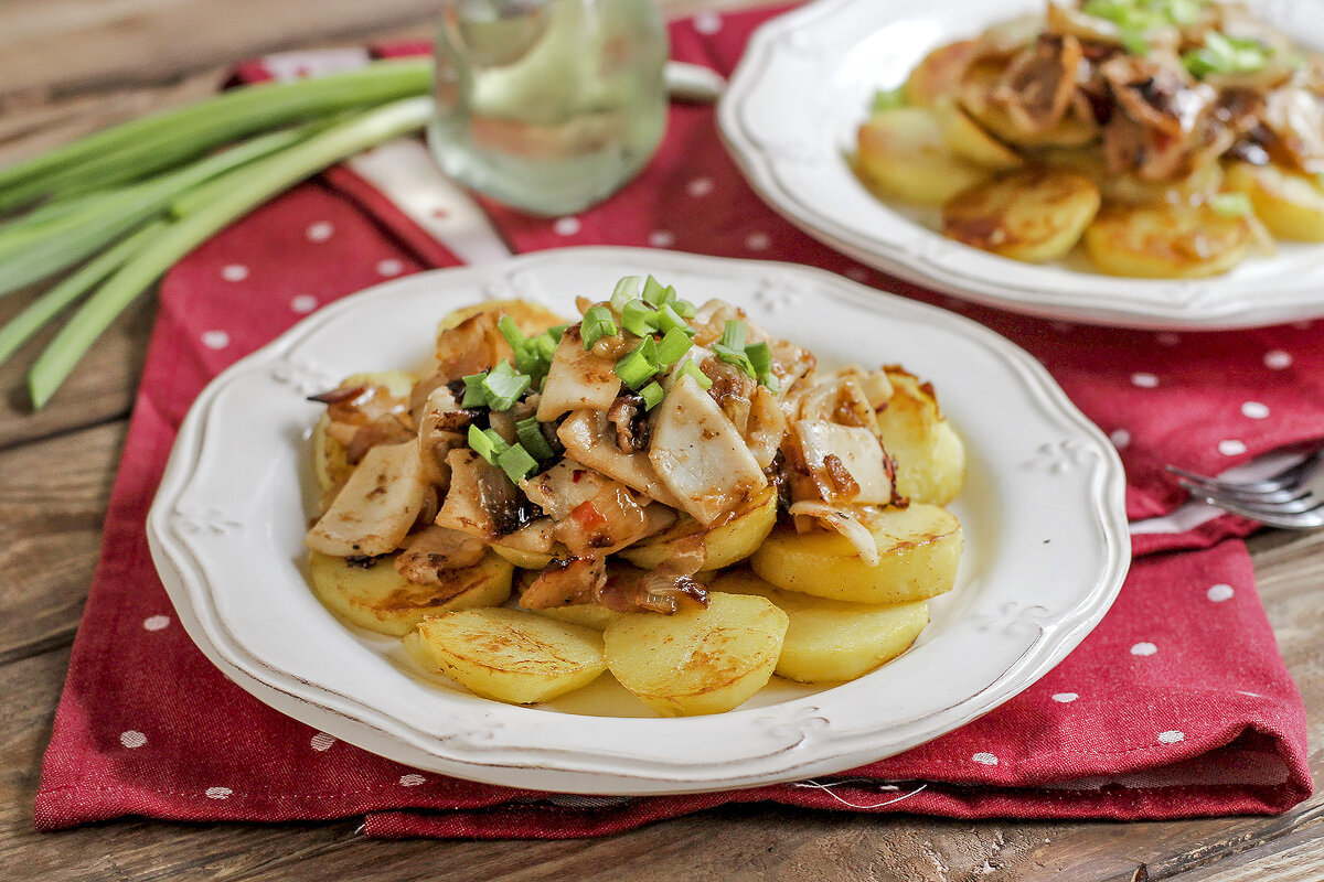 Блюдо готово! Кальмары на фоне золотистого картофеля создают теплую уютную атмосферу. Наслаждайтесь великолепным вкусом!