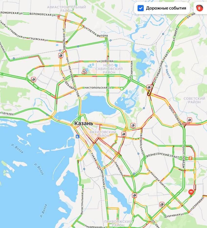 Из-за долгожданного снегопада Казань встала в не долгожданных пробках. Праздничный вайб гирлянды на картах присутствует.