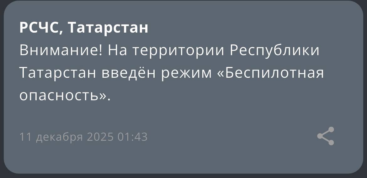 Он был введён в 01:43.Режим вводится в случае выявления беспилотных летальных аппаратов, движущихся по направлению к нашей республике.@nashtatarstan_official