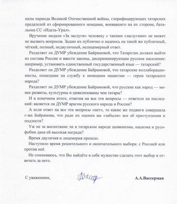 «Вручение медали «За заслуги» человеку с такими «заслугами» не может не вызвать вопросов. Задаю их публично и надеюсь на такой же публичный, чёткий, полный, недвуличный, нелицемерный ответ.-отметил Вассерман в своем письме.Разделяет ли ДУМР убеждение Байрамовой, что Татарстан должен выйти из состава России и ввести законы, дискриминирующие русское население: например, установить единственный государственный язык - татарский?