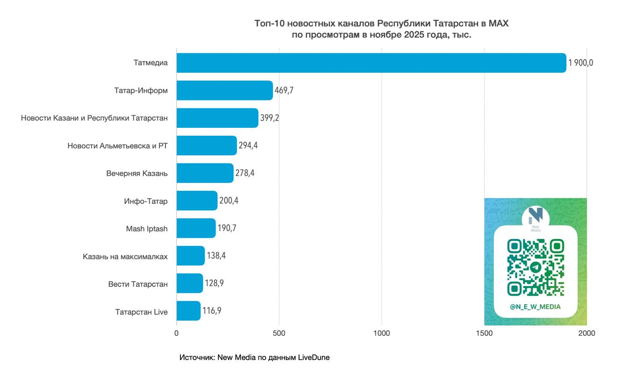 Телеграм-канал New Media опубликовал Топ-10 новостных каналов Республики Татарстан в MAX по просмотрам в ноябре 2025 года