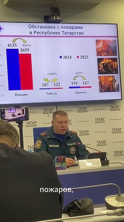 В Татарстане с начала года произошло 3655 пожаров, что на 11% меньше, чем за прошлый год. Об этом на пресс-конференции в ИА "Татар-информ" сообщил заместитель начальника Главного управления МЧС России по РТ Максим Трущин. Он отметил, что в результате пожаров погибли 122 человека, в том числе пять детей. Травмы на пожарах различной степени тяжести получили 167 человек, что на почти 14% меньше, чем в 2024 году.