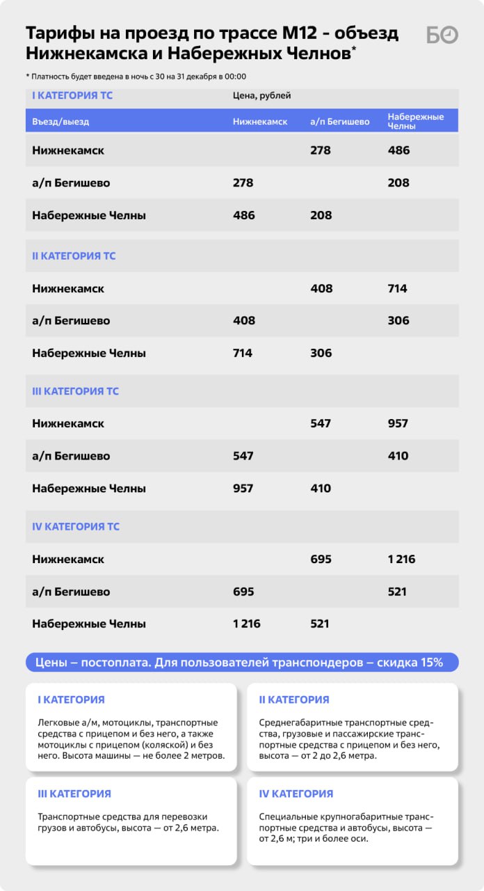 Стоимость проезда от Челнов до Нижнекамска для обычных легковушек (первая категория) составит 486 рублей, от Нижнекамска до Бегишево — 278 рублей, от Челнов до Бегишево — 208 рублей. Тарифы для других категорий смотрите в карточке