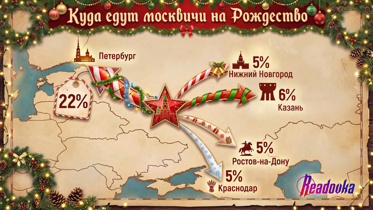 Каждый пятый столичный житель, купивший билеты на поезд, самолет или автобус на рождественские праздники, выбрал Санкт-Петербург. На Северную столицу пришлось 22% всех бронирований, рассказали Readovka в сервисе «Туту». Значительно отстают Казань (6%), Ростов-на-Дону, Нижний Новгород и Краснодар (по 5%).
