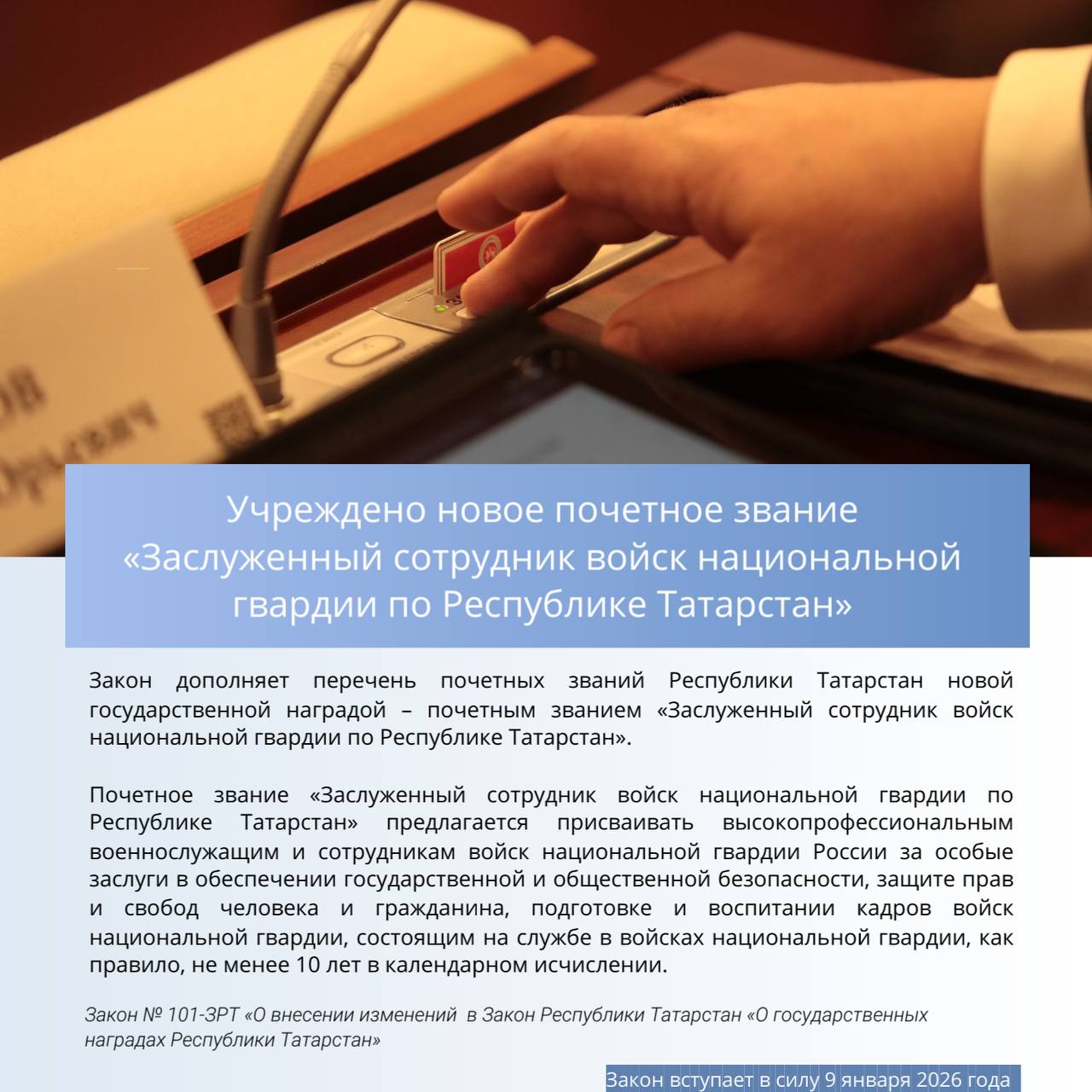 учреждено новое почетное звание «Заслуженный сотрудник войск национальной гвардии по Республике Татарстан»;
