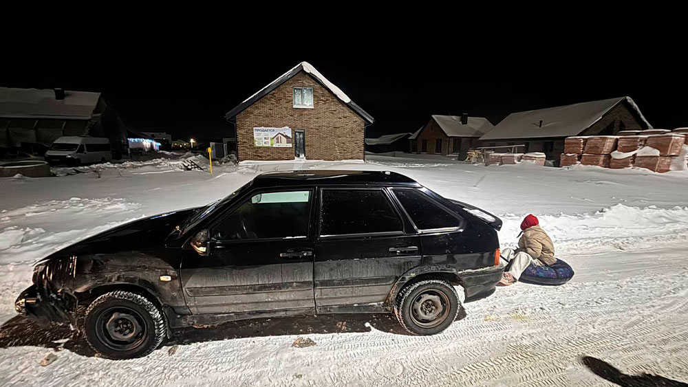 Юноша, чей стаж вождения составляет всего два месяца, решил покатать свою спутницу на тюбинге, привязав его к своему автомобилю на улице Кедровой.