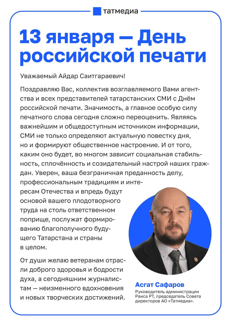Руководитель Администрации Раиса Татарстана Асгат Сафаров направил поздравительную телеграмму в День российской печати