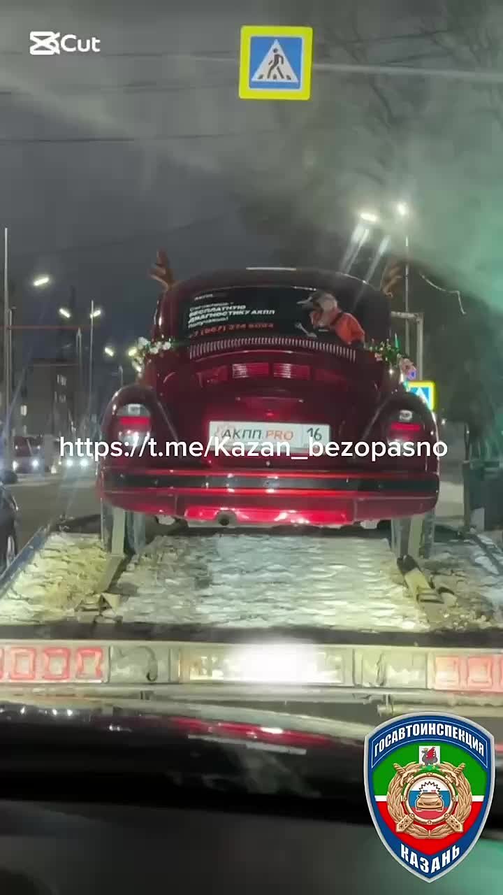В Казани сотрудники ГАИ наказали водителя эвакуатора, который перевозил на платформе автомобиль Volkswagen, внутри которого находился пассажир. Во время движения девушка в новогодней шапке выглянула из окна иномарки, стоящей на платформе. Ролик привлек внимание автоинспекторов.