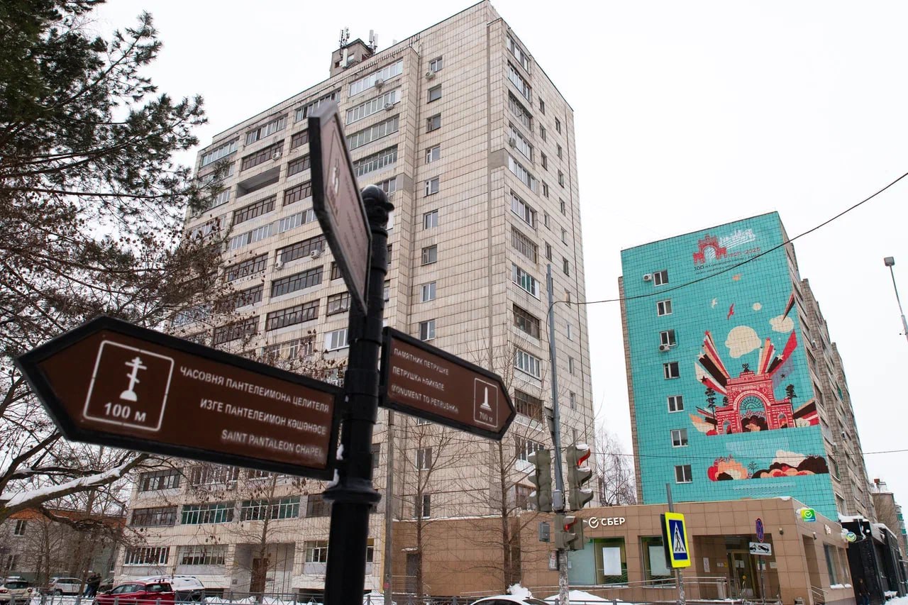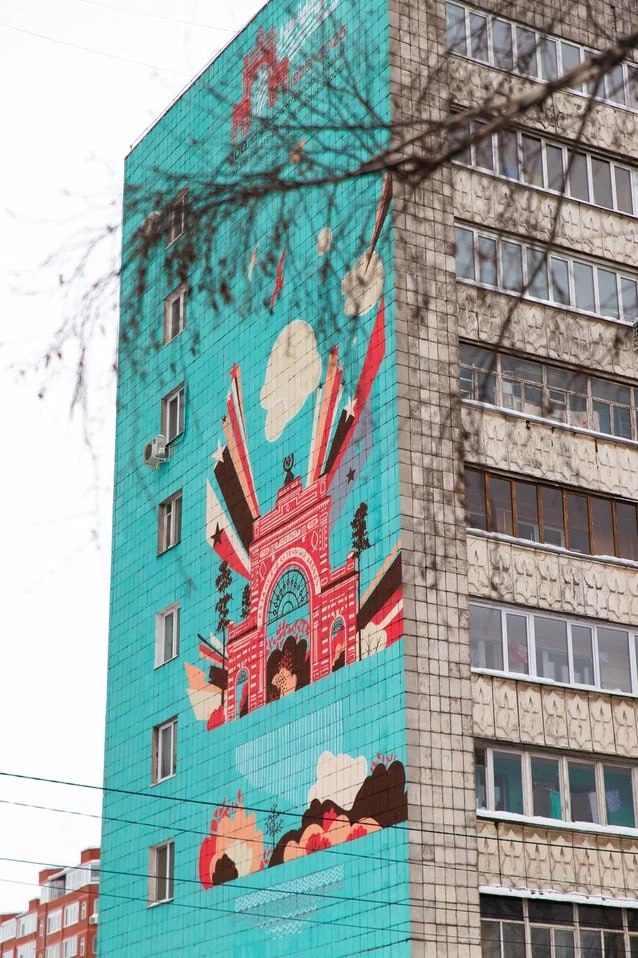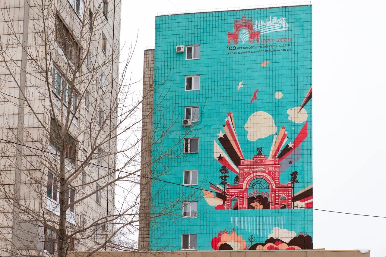 Подумали мы, когда увидели новый мурал на фасаде дома по улице Клары Цеткин, 11. На нем изображена арка «Красные ворота» — один из узнаваемых символов Кировского района, который недавно отпраздновал свое 100-летие