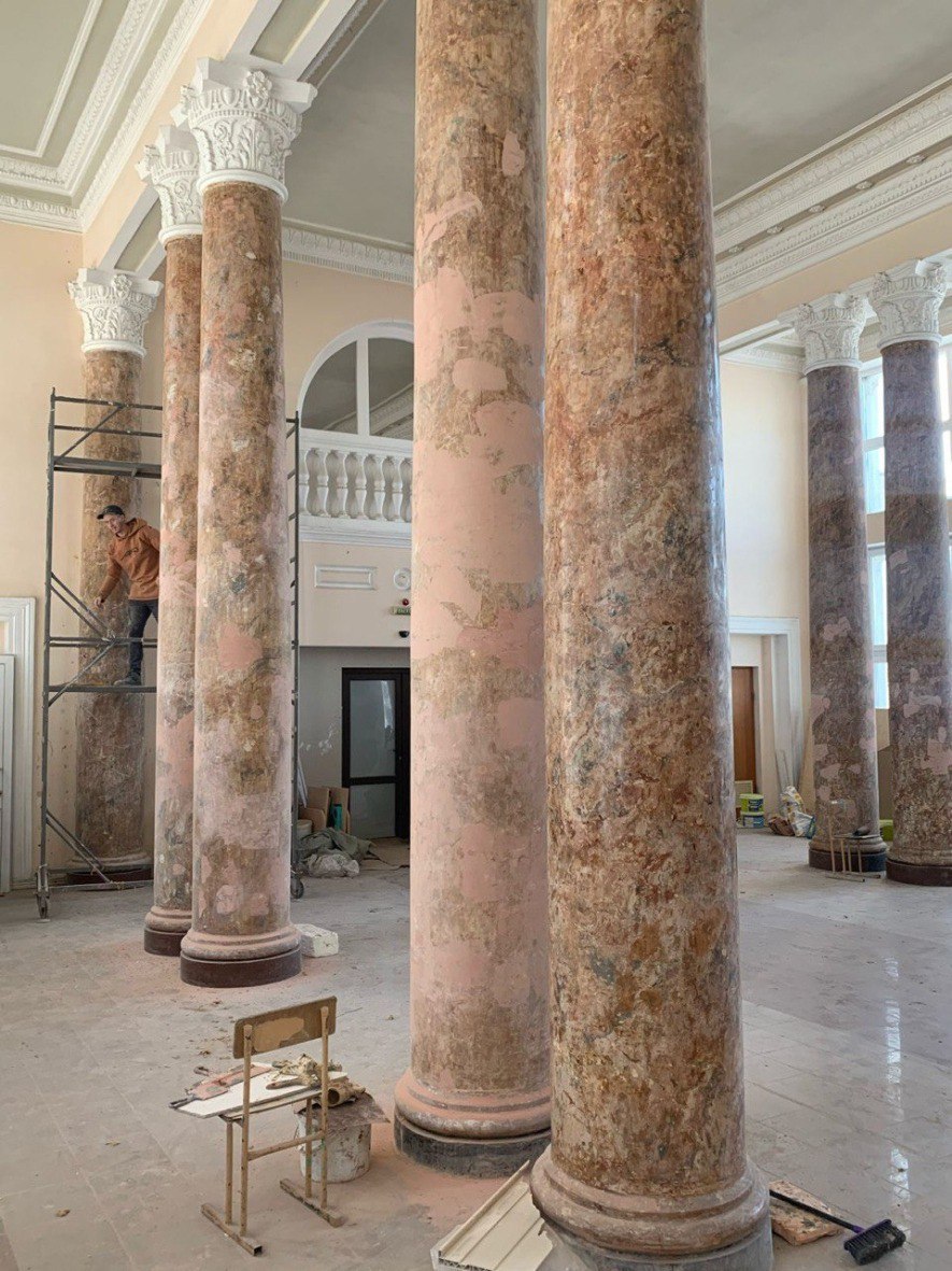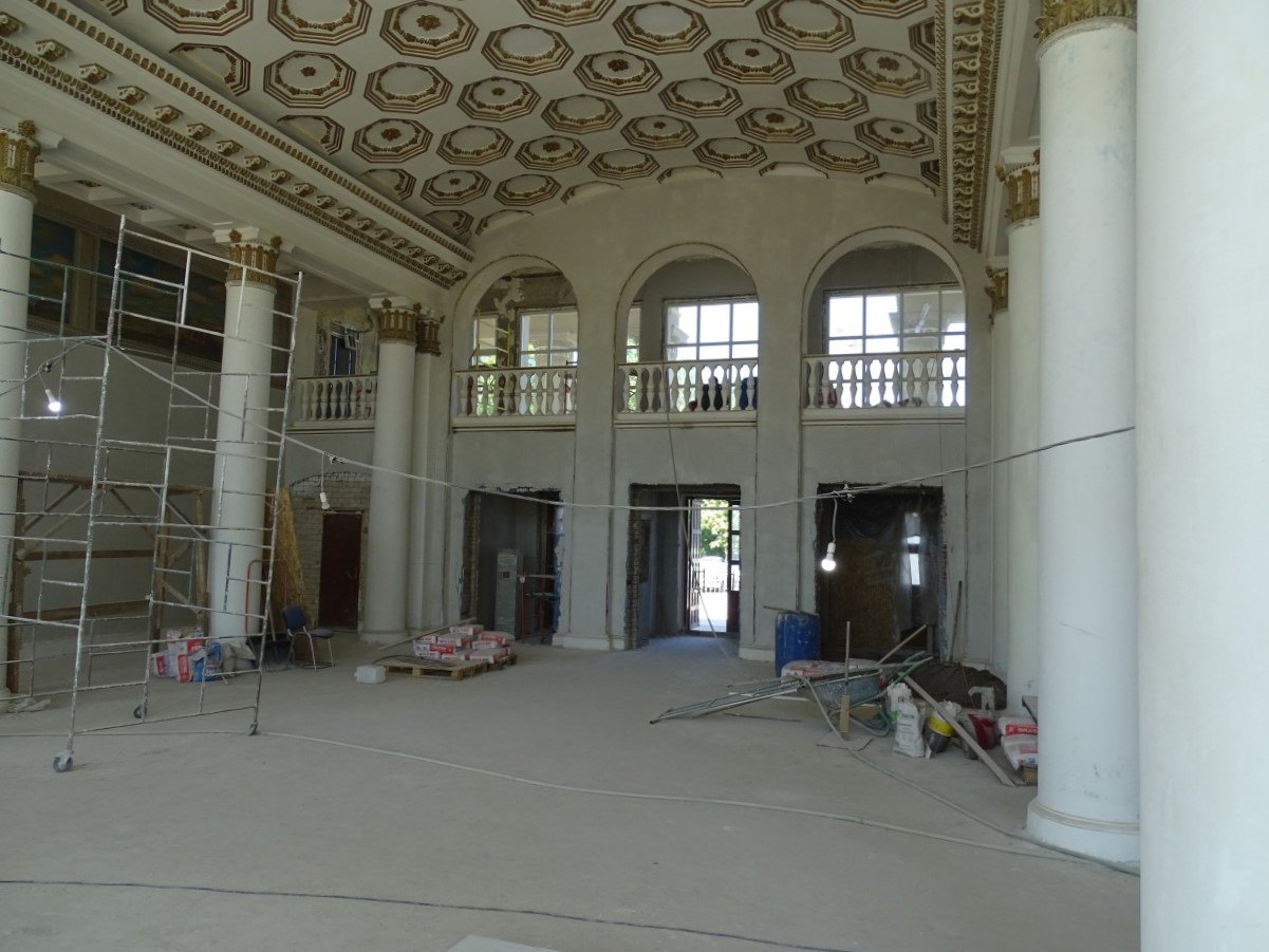 В интерьерах восстанавливаются лепные элементы, отреставрирован штукатурный слой стен и потолков, обновлены колонны под искусственный камень, модернизированы инженерные коммуникации.