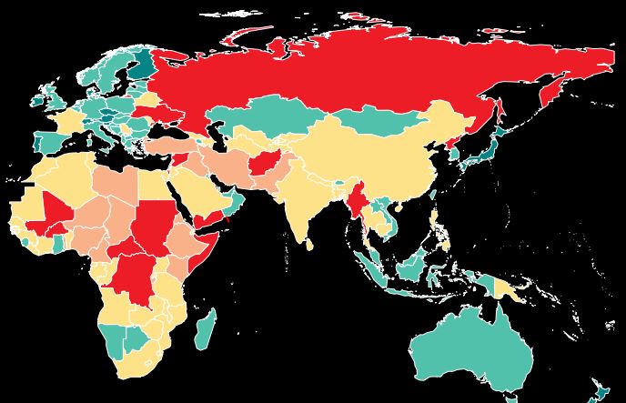Одними из самых небезопасных стран признали Судан, Конго и Йемен. Лидерами рейтинга стали Исландия, Ирландия, Новая Зеландия, Австрия и Швейцария.