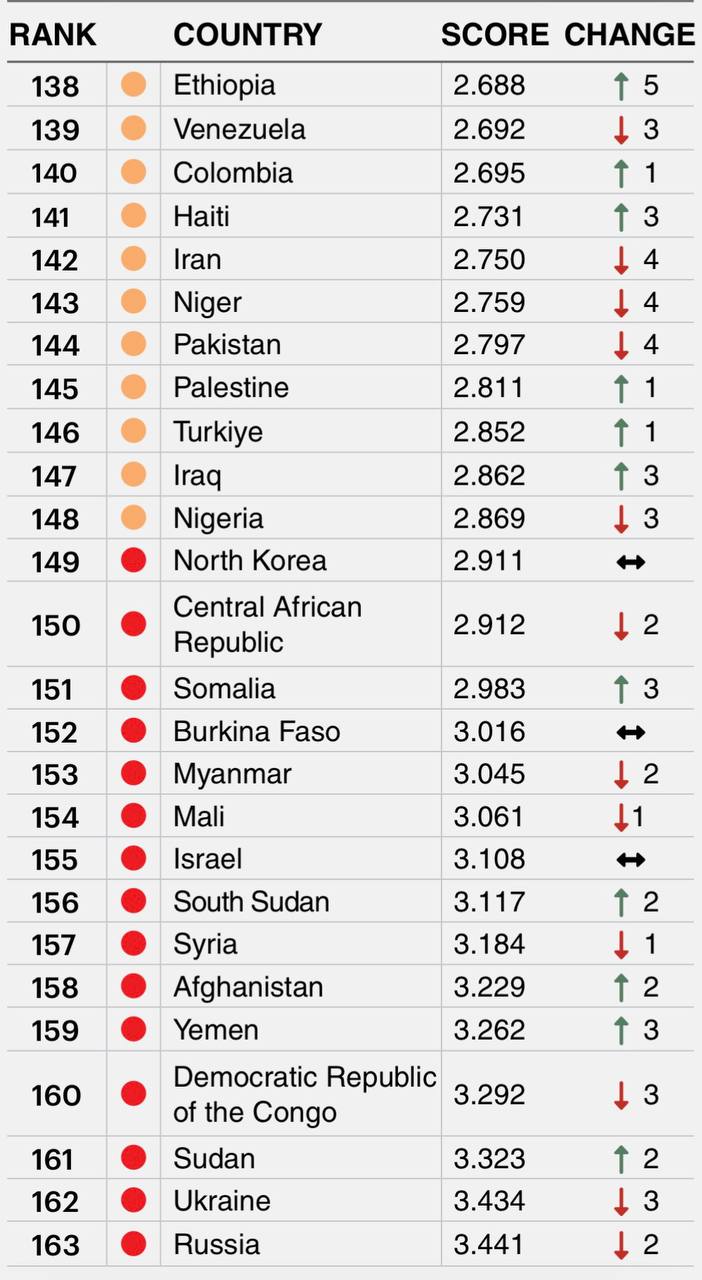 Россия заняла последнее из 163 стран место в глобальном индексе мира Института экономики и мира (IEP). За 2025 год ее понизили на две строчки. Украина же упала до предпоследнего 162 места, потеряв три позиции.
