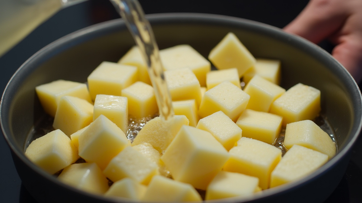 Когда вода нагревается, картофель нарезается крупными кусками, чтобы избежать разваривания. Небольшая общая хитрость заключается в том, что прежде чем готовить пюре, нужно дать картофелю немного остыть. Это позволяет создать более плотную текстуру и делает будущие котлеты более послушными при формировании.