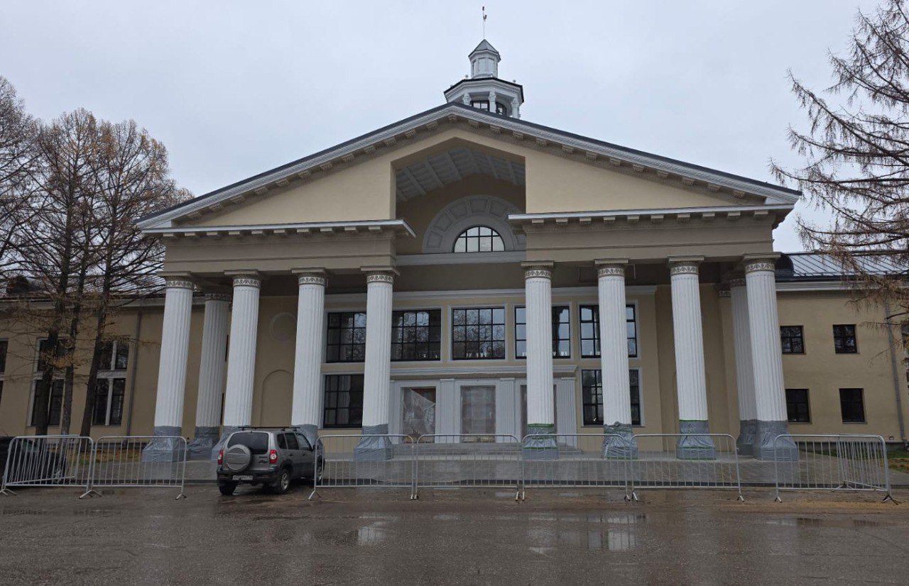 Фасады будут окрашены в историческую цветовую гамму, благоустраивается прилегающая территория. Восстановительные работы продолжаются.