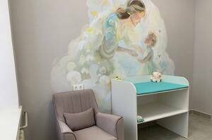 Помещение оснащено всем необходимым для комфортного пребывания родителей с детьми. В комнате имеются зона для кормления и отдыха, пеленальный столик, а также функциональная зона для подготовки детского питания.