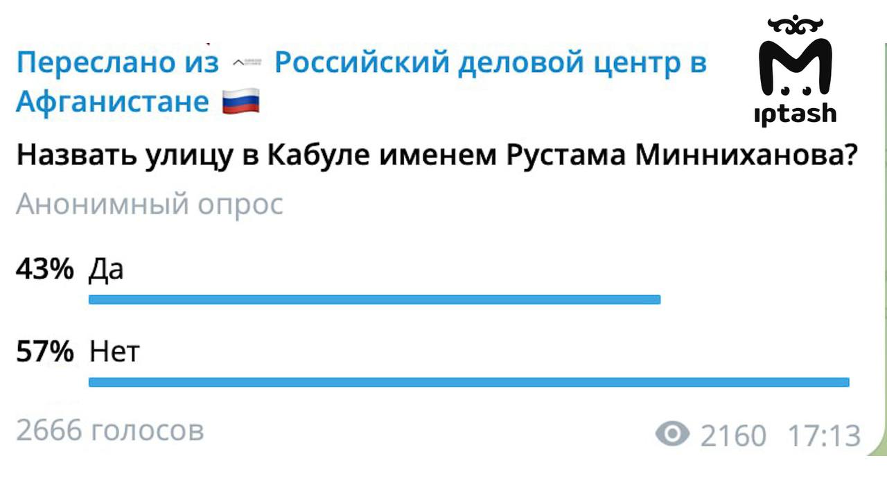 Как пишут в канале организации, Татарстан — самый активный регион на афганском рынке, а Кабул вовсю ширится: строятся дороги, появляются новые районы и улицы. Собственно, поэтому в центре и предлагают назвать одну из них фамилией раиса. Правда, для этого нужно набрать голоса, опрос — прямо в телеге. Перевес — в сторону НЕТ: 57% против 43%.