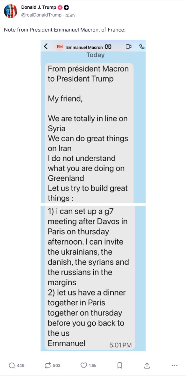 «Я могу организовать встречу G7 после Давоса в четверг. Я могу пригласить украинцев, датчан, сирийцев и русских», — говорится в опубликованном скриншоте.