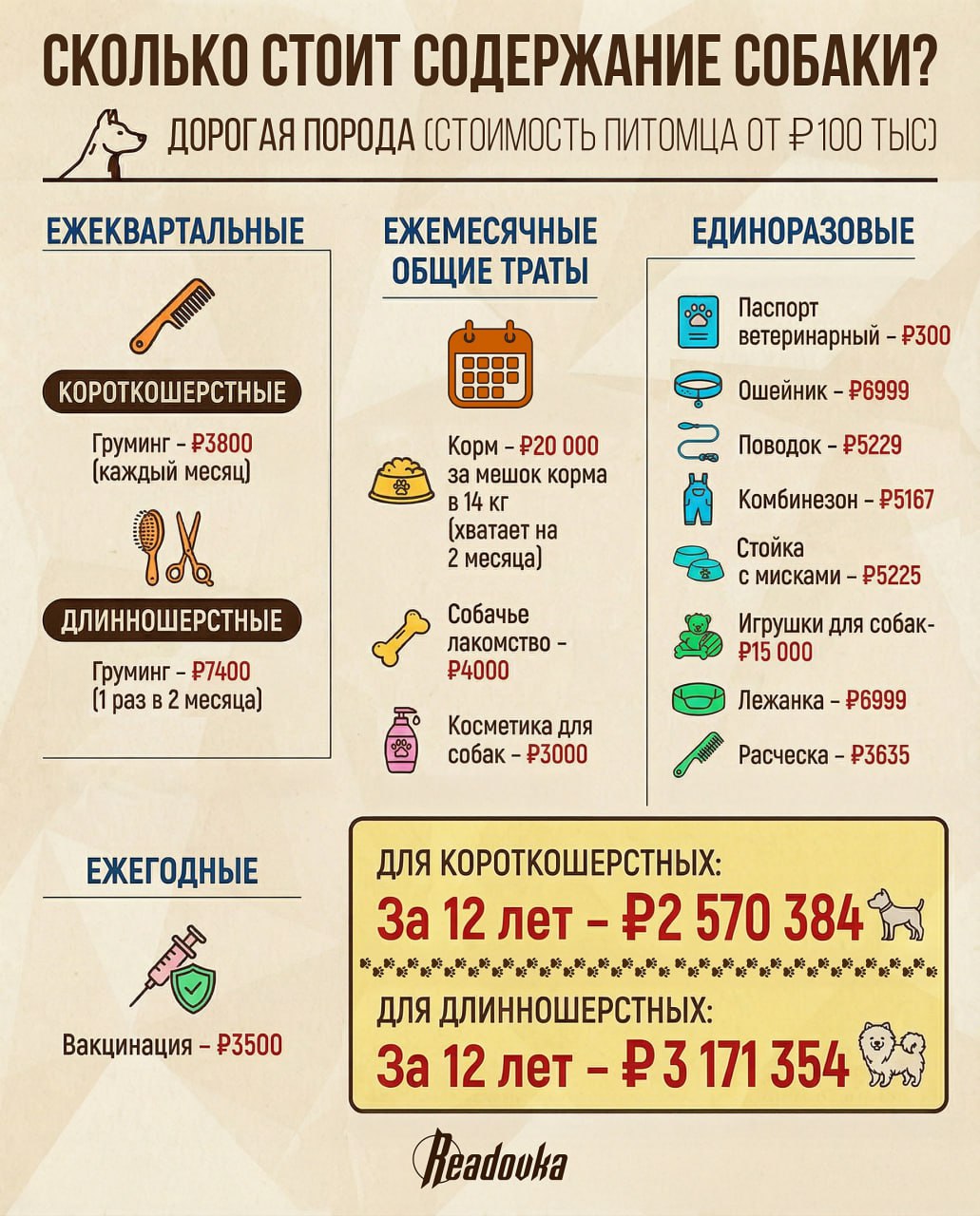 Содержание любой собаки встанет в копеечку семейного бюджета. Основными расходами на четвероного друга считаются корм, груминг, косметика. Существуют и сезонные траты: одежда, ветеринария, противоклещевые препараты. Чтобы содержать дорогую породу собак (стоимостью 100 тыс), придется тратить 265 тыс в год. Бюджетные же породы (до 5 тыс) обойдутся примерно 76 тыс в год. За среднюю жизнь собаки в 12 лет элитная порода обойдется хозяину в 3,17 млн, тогда как бюджетная порода — 900 тыс. Почему столько получилось, смотрите в нашей карточке.