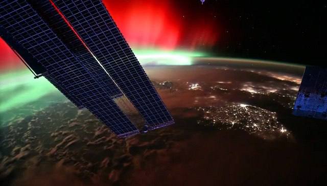 Редкое красное полярнаое сияние окрасило небо на высоте МКС после мощной солнечной вспышки. Космонавт Сергей Кудь-Сверчков описал это как «плавание внутри света». Зеленые сияния привычны, но красное наблюдается крайне редко — на высоте 300–400 км.