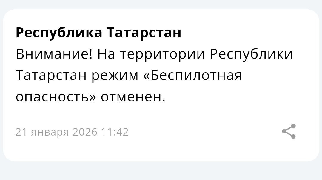 «Беспилотная опасность» - в случае выявления БПЛА, движущихся по направлению к республике.«Угроза атаки БПЛА» - если беспилотники обнаружены на территории Татарстана.@tatmediaofficial | Все каналы Татмедиа™ 1-й новостной MAX-канал Татарстана -...