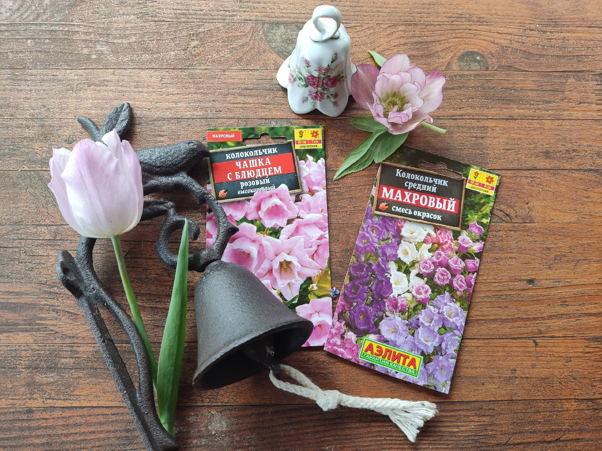 Среди семян, которые были посеяны, можно выделить белую шток-розу, турецкую гвоздику, незабудку и виолу. К сожалению, наперстянки и розовая шток-роза не показали себя. Однако, колокольчик, поговорим о нем подробнее, распустил свои цветы благодаря рассадам, выращенным в предыдущем году.