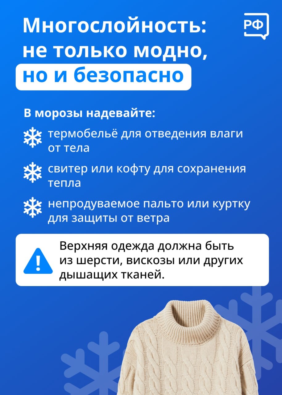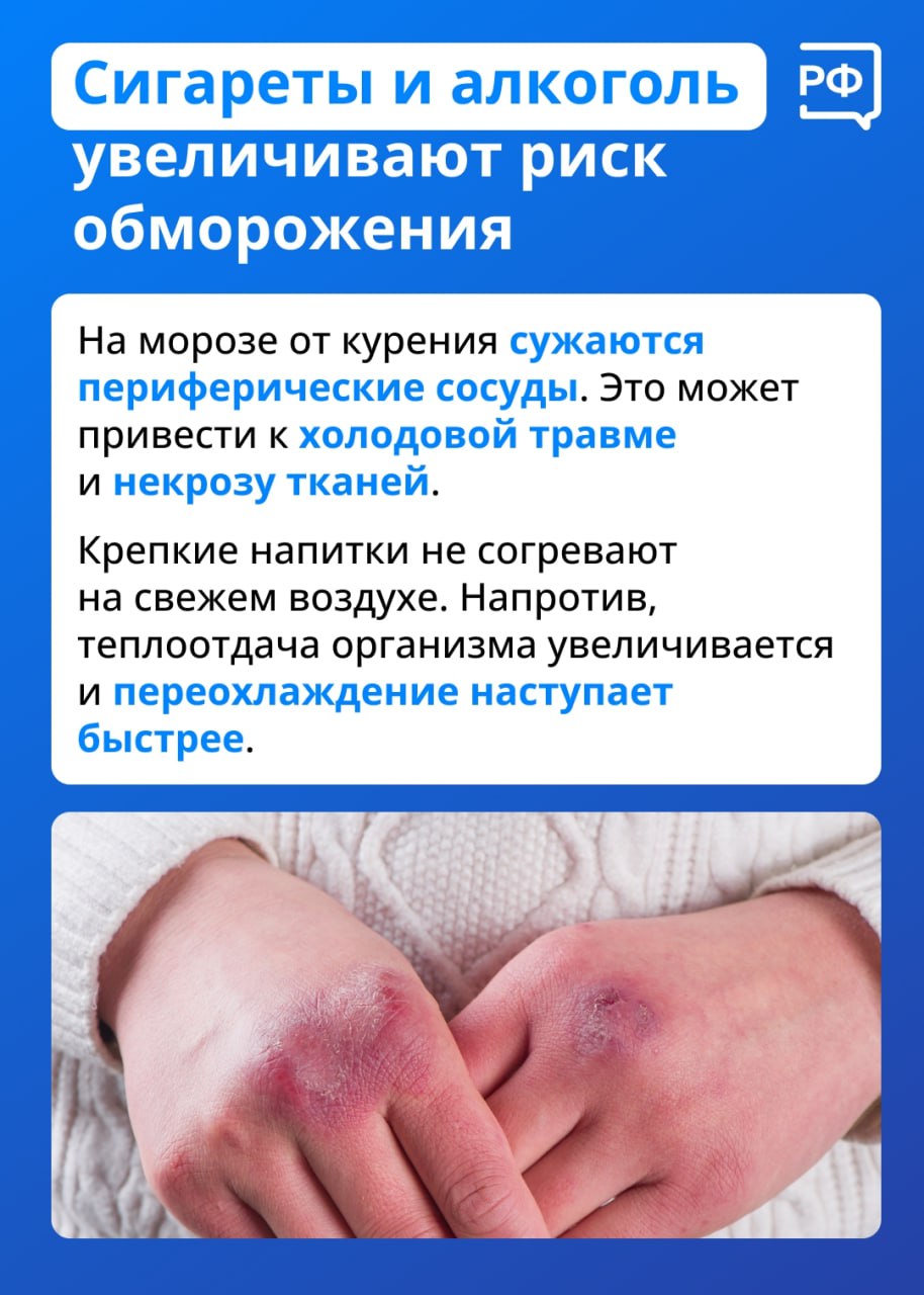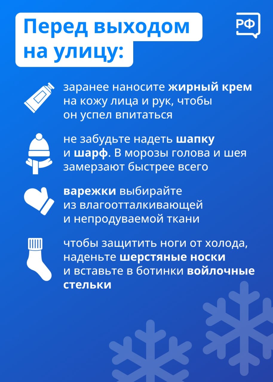 МЧС предупреждает, что завтра в республике ожидается понижение температуры до -35 °C. В сильный холод получить обморожение легче, чем кажется. Для этого достаточно выйти на улицу без перчаток или не закрыть лицо. Как правильно одеваться и что делать при обморожении — смотрите в карточках