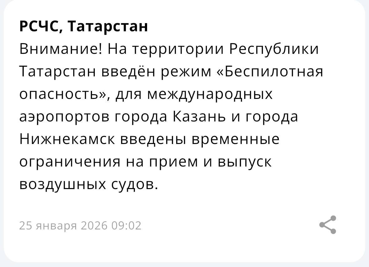 Режим вводится в случае выявления беспилотных летальных аппаратов, движущихся по направлению к нашей республике.Для аэропортов Казани и Нижнекамска введены временные ограничения на прием и выпуск воздушных судов.Подписаться...