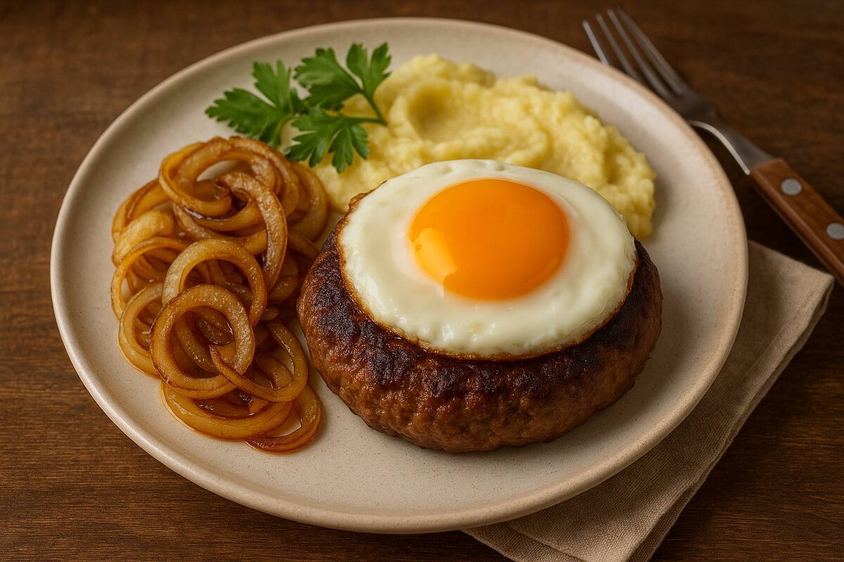 Слово «бифштекс» пришло к нам из Европы — «beef steak» означает говяжий стейк. Однако россияне быстро адаптировали это блюдо под свои особенности, заменив ценный кусок мяса на фарш, а сверху добавив жареный лук и иногда яйцо. В результате вышла совершенно другая концепция: это уже не ресторанная изысканность, а яркий символ домашнего ужина.