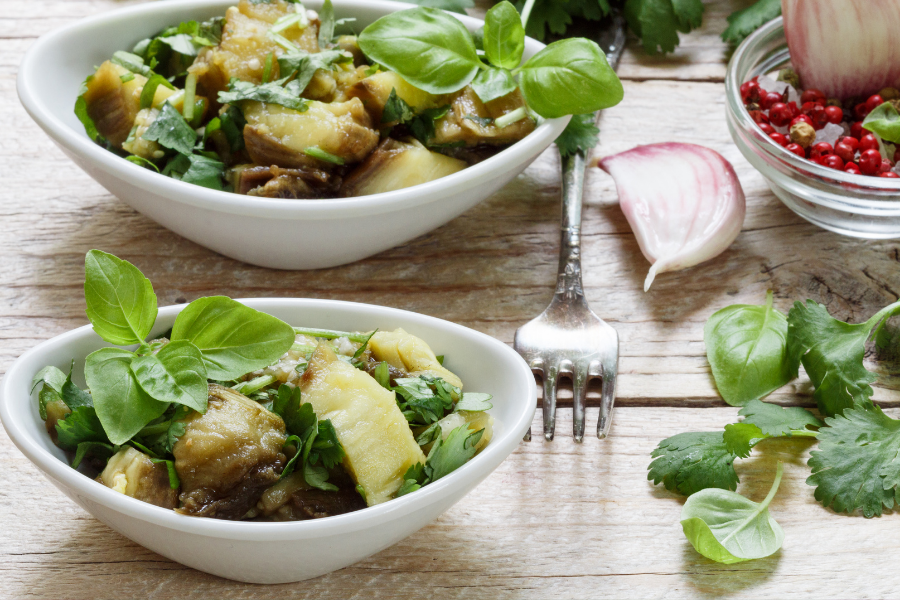 Эффект неожиданности часто скрывается в простом сочетании — тонкая сладость баклажана встречает зелень и пряный акцент соуса, создавая освежающую волну вкуса, которая возвращает к лету даже в будний вечер.