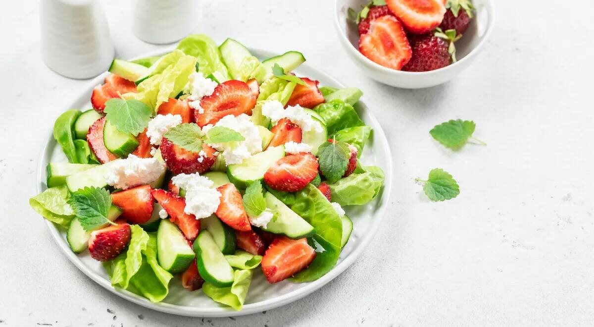 Хрустящие ломтики огурца встречаются с сочной клубникой, создавая освежающую основу. Небольшой акцент на зелень и легкую заправку делает салат полезным и подходящим для дневного перекуса между делами.