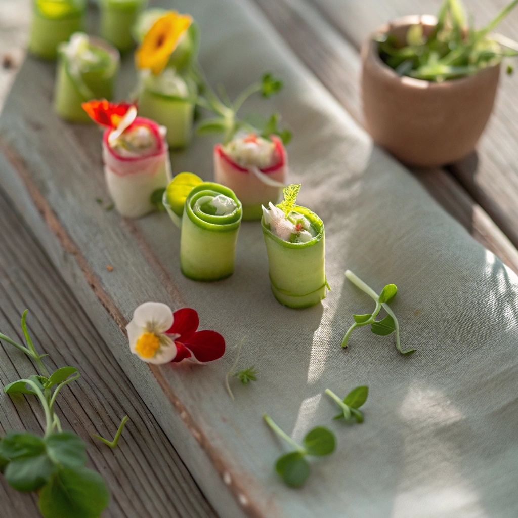 Ингредиенты подачей на четверых напоминают набор для быстрой закуски: огурцы, тофу на растительной основе, укроп, чеснок и лимон. Простой процесс превращает каждый ленту огурца в маленькое платье из кремовой нотки и зелени. По завершении рулетики выглядят чистыми и легкими, а вкус — освежающим и мягким.