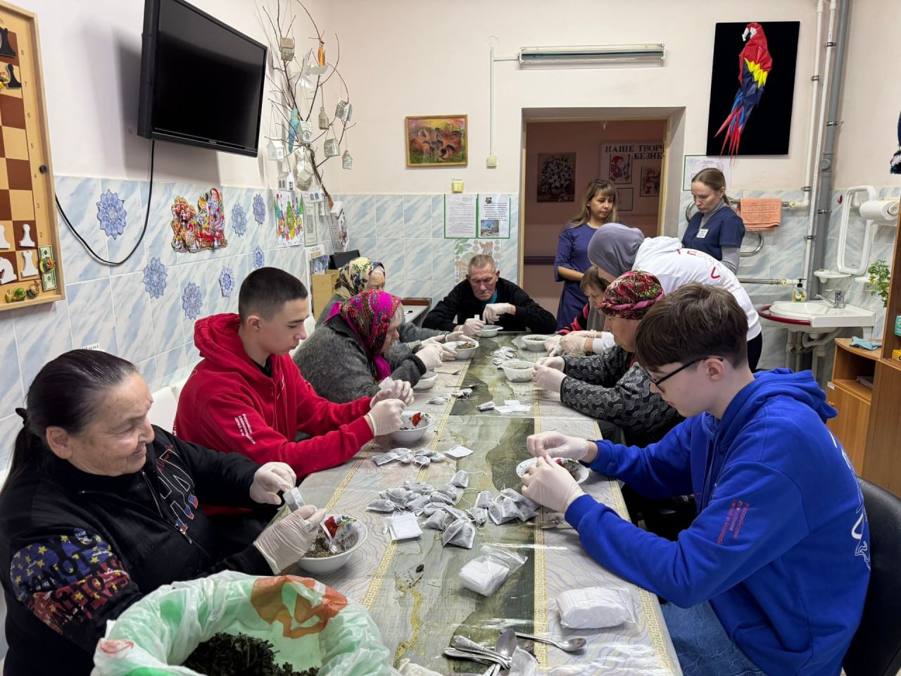 Нурлатские школьники и волонтеры из дома-интерната вместе создают травяные чайные сборы для военнослужащих. За общим столом старшее поколение делилось рецептами, а молодёжь помогала с упаковкой.