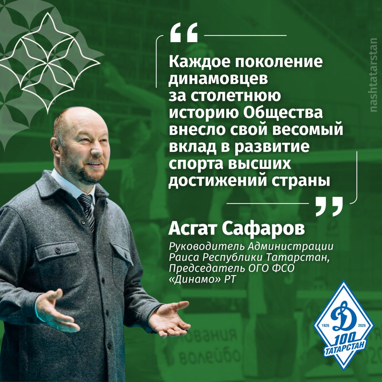 Он отметил, что за прошедшее столетие Динамо Татарстана признано лучшим физкультурно-спортивным обществом среди региональных организаций Всероссийского общества Динамо. Спортсмены Общества неоднократно становились призерами Олимпийских игр, чемпионатов мира и Европы.