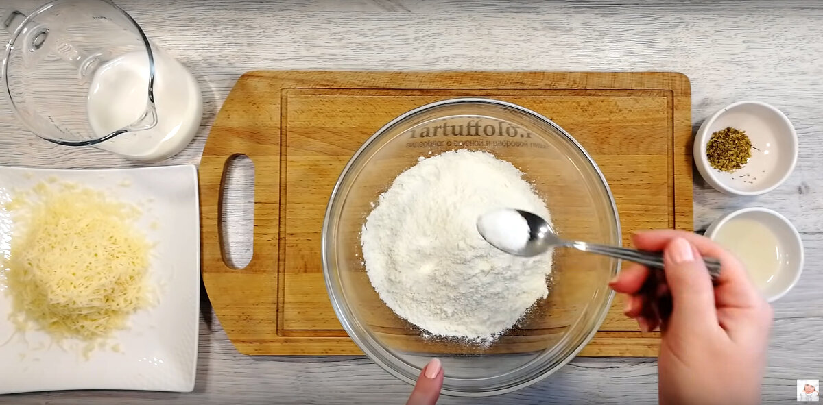 Смешать муку с солью и орегано, ввести тёртый сыр. Добавить растительное масло и тщательно перемешать. Понемногу вливать тёплое молоко, замешивая тесто вручную до состояния, когда оно не липнет к рукам, но остаётся плотным — у автора ушло около 80 мл.