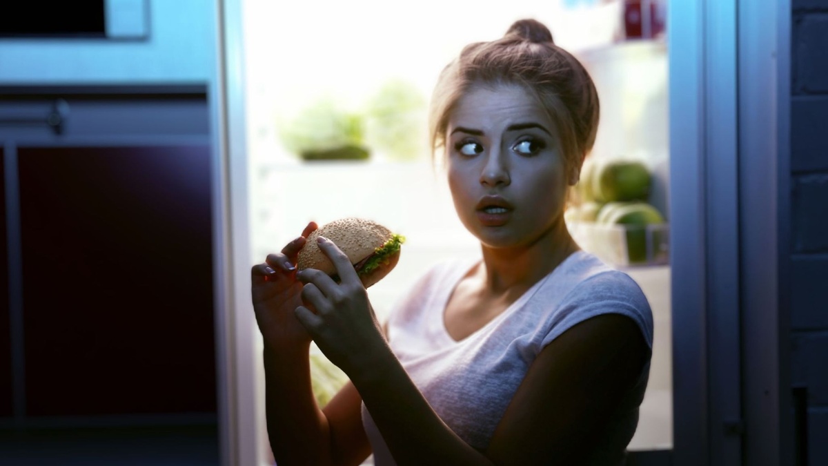 В этот момент организм "включает" голод, усиливая аппетит и стремление к высококалорийной пище. Это не слабость, а реакция на недополученные калории в течение дня.