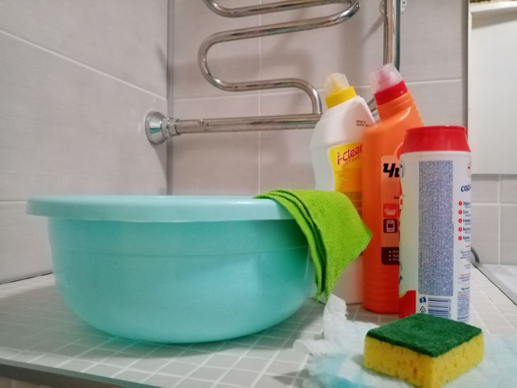 Для усиления чистящего эффекта добавляют полстакана уксуса (9%) и немного хозяйственного мыла.