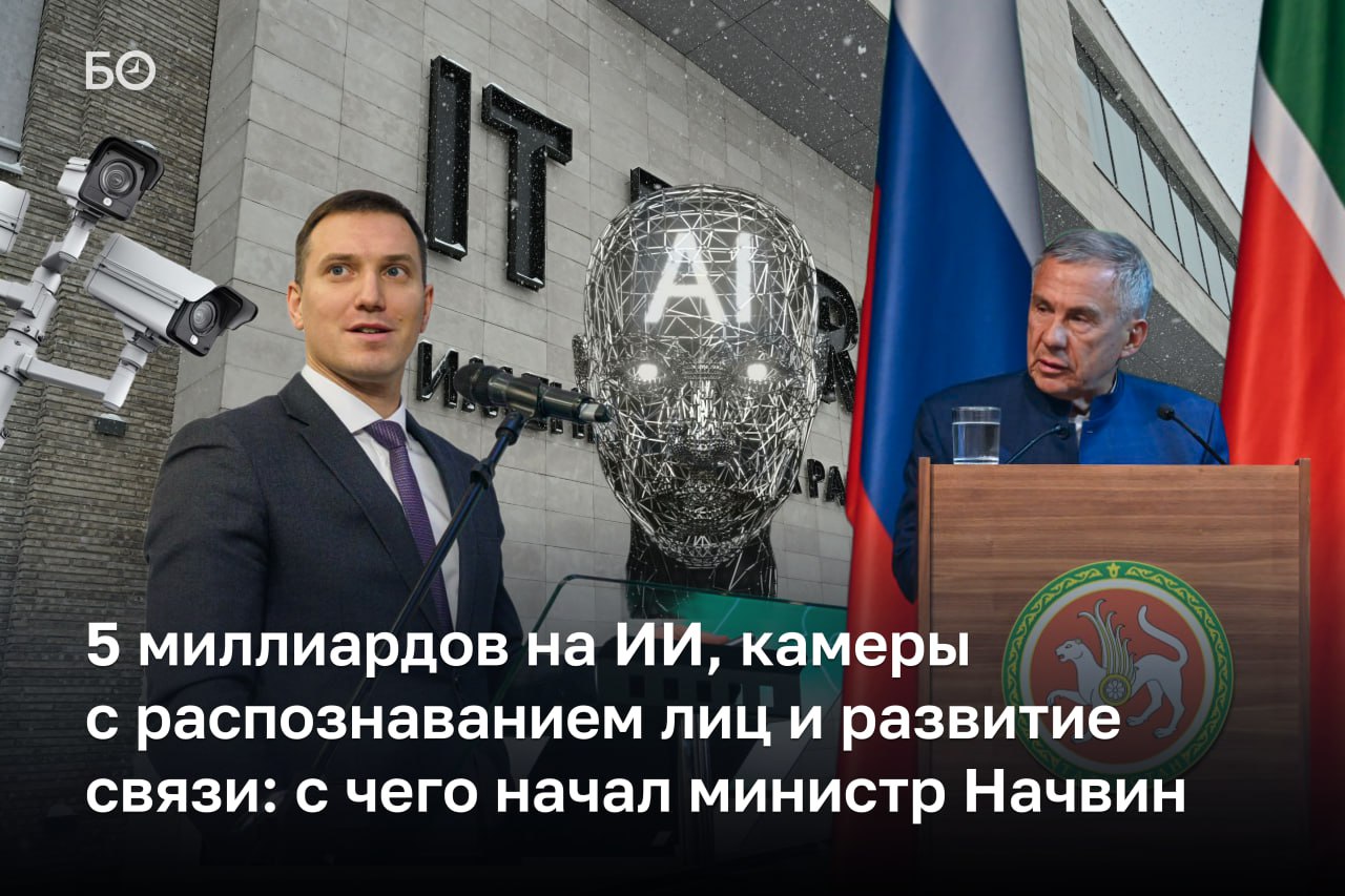 Накануне прошла коллегия минцифры РТ — первая под руководством нового главы ведомства Ильи Начвина. Среди озвученных планов: пятилетняя программа развития технологий ИИ, установка новых базовых станций мобильной связи, внедрение отечественной системы видеонаблюдения с распознаванием лиц.