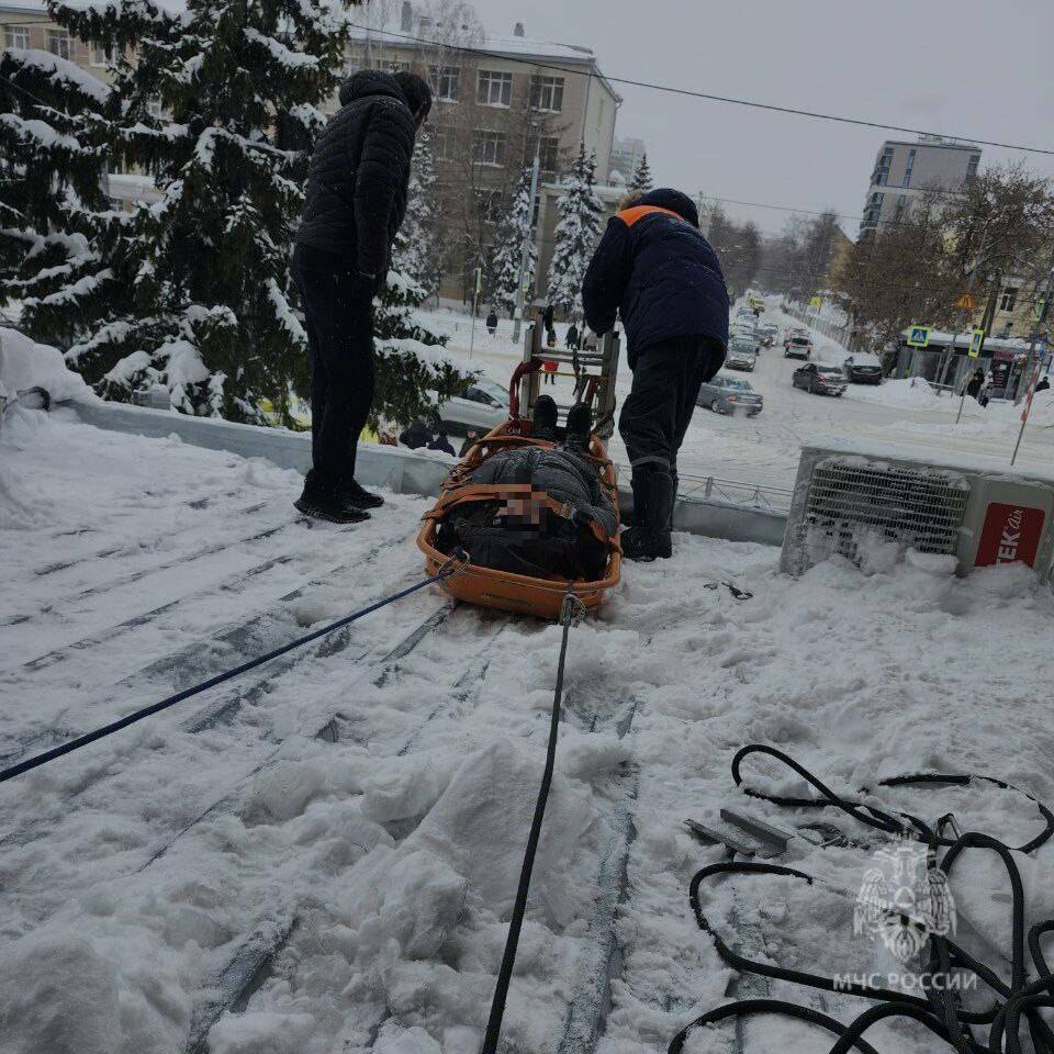 Спасатели оперативно прибыли на место. С помощью трехколенной лестницы они поднялись на крышу, профессионально зафиксировали пострадавшего на специальных жестких носилках «акья» и с применением альпинистского снаряжения аккуратно спустили его на землю.