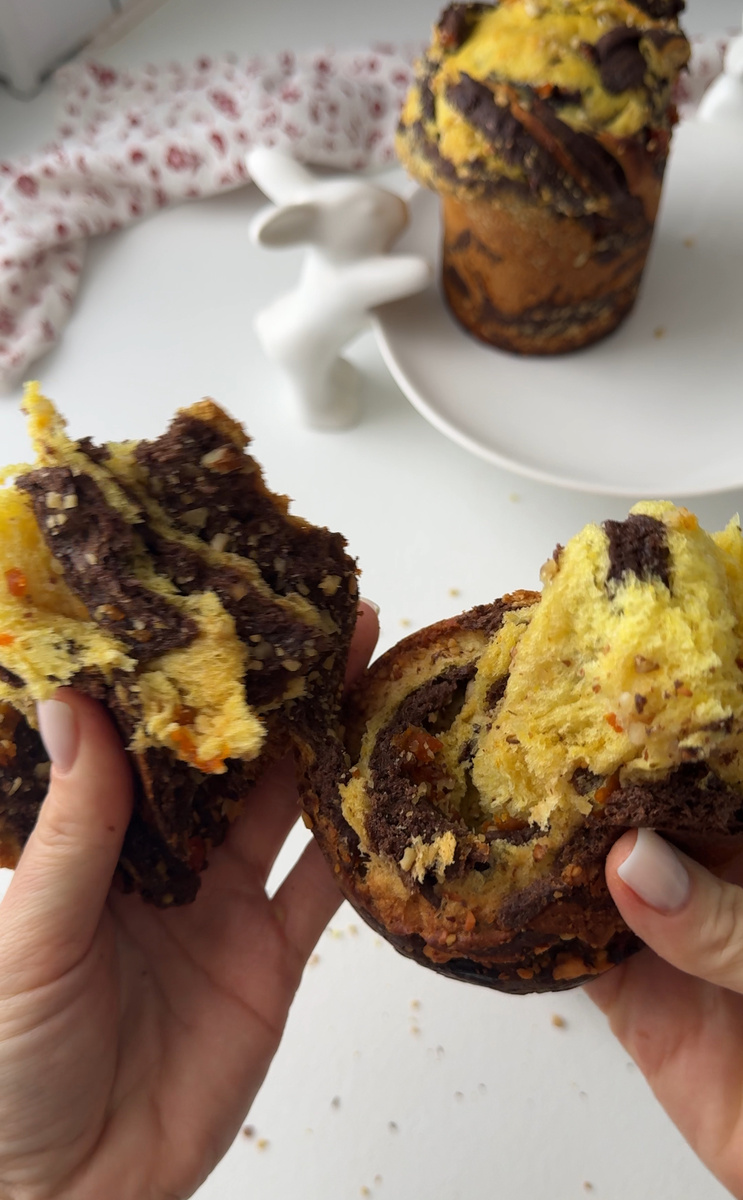 Когда тесто увеличится в объеме в 2-3 раза, следует разделить его на две части и раскатать в пласты. Начинать нужно с апельсинового теста, на которое нужно намазать масло, присыпать орехами и сухофруктами, а сверху накрыть шоколадным тестом, также смазанным маслом. Затем свернуть, разрезать не до конца и аккуратно оформить краффины согласно видеоуроку.
