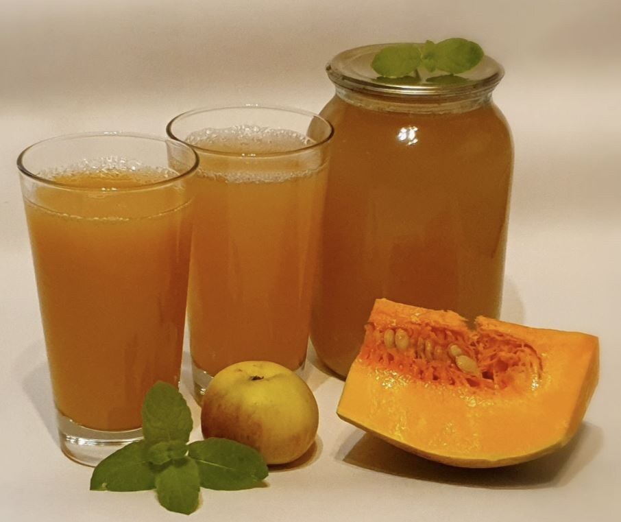 - Тыквенный сок с яблоками и морковью: 500 г тыквы, 300 г яблок, 200 г моркови, 100–150 г сахара. Варите все вместе, затем измельчите и разлейте. Этот сок порадует ярким вкусом и насыщенностью витаминов.