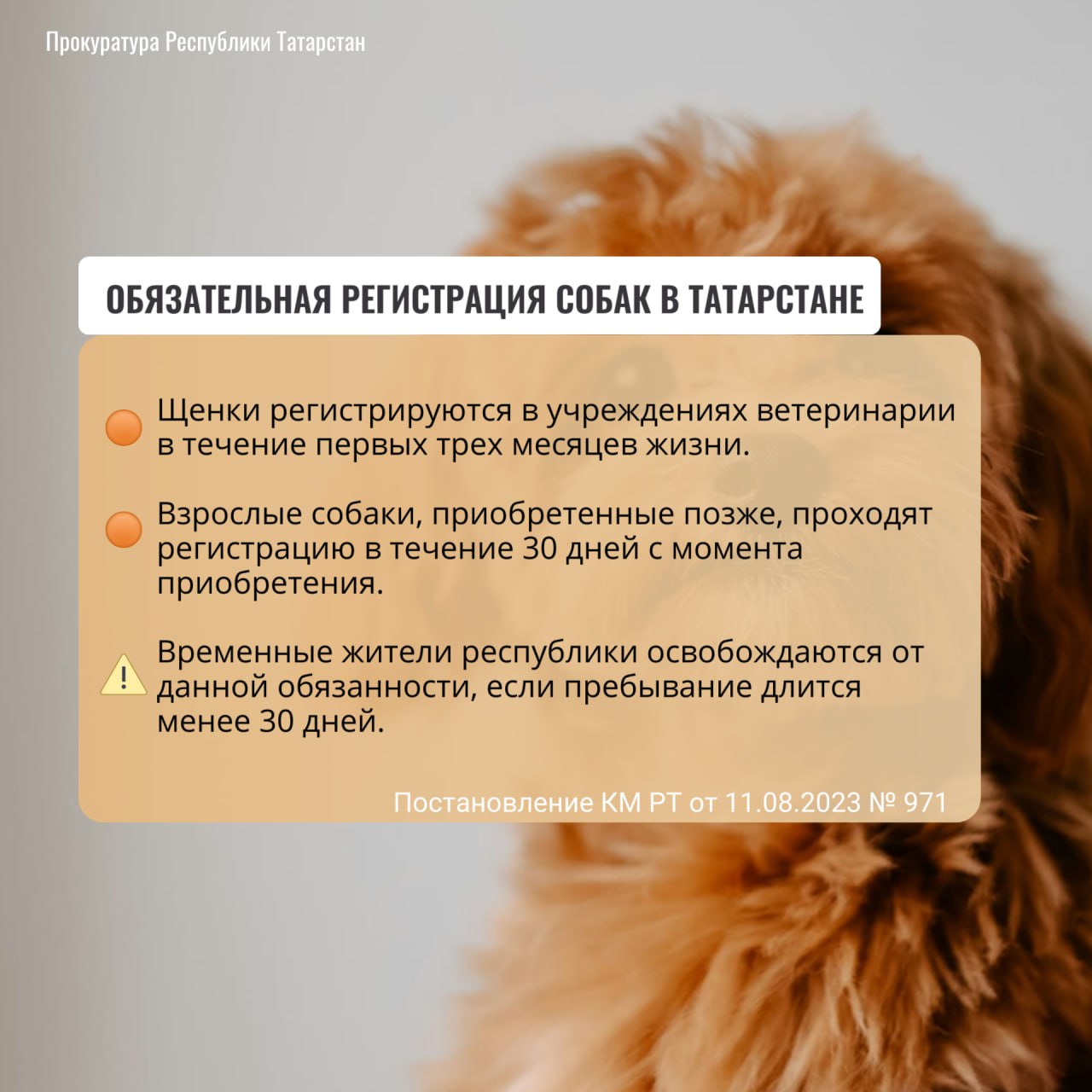 Дополнительные требования к содержанию домашних животных, в том числе к их выгулу, на территории Республики Татарстан утверждены Постановлением Кабинета Министров Республики Татарстан от 11.08.2023 971.
