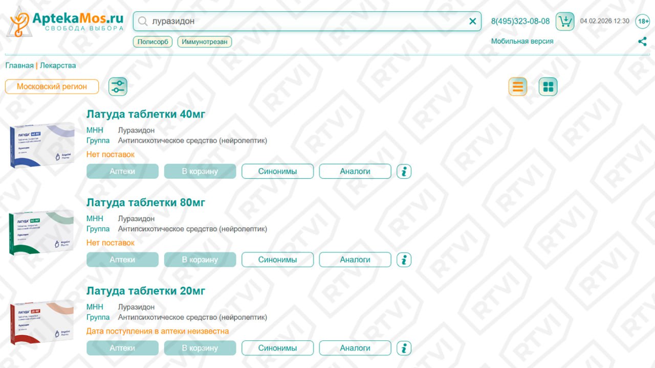 По данным агрегатора Apteka Mos, 4 февраля Латуда не была доступна ни в одной из аптек в 67 регионах, с которыми работает сайт. Нет лекарства и в онлайн-магазинах крупнейших федеральных аптечных сетей Ригла, 36,6, АСНА и других.