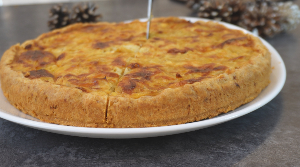 Для теста нужно просеять муку, добавить соль и разрыхлитель, затем ввести холодное сливочное масло и перетереть до состояния крошки. После этого добавить сметану, замесить мягкое тесто, которое лучше всего распределить в форме диаметром 24 см. Сначала готовится начинка: к остывшему луку добавляются яйца и тертый сыр.